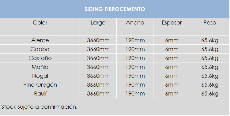 Es una placa de fibrocemento con textura de madera. Se puede dimensionar e instalar como revestimiento de muros en el formato desado. Una vez instalado se pueden aplicar diferentes pinturas o tintes al agua para darle la terminación de color deseado.